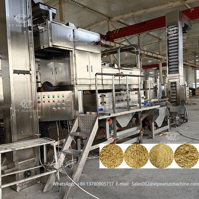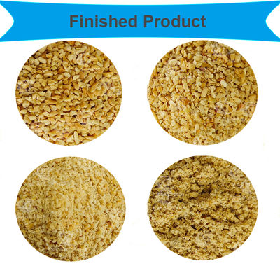 De machine is voorzien van een tweestaps hakproces: gespleten geblancheerde pinda's worden via een verticaal vervoerband gevoerd en eerst in grove korrels gehakt.vervolgens in een tweede fase verwerkt om menggranulatoren te makenEen geïntegreerde trillingszieper sorteert de output in vier uniforme specificaties: 5-8 mesh, 8-10 mesh, 10-12 mesh, met materiaal onder de 12 mesh die een poedertextuur bereikt.