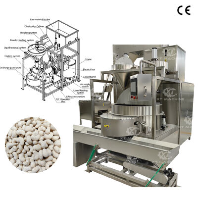 Het systeem beschikt over een basisproduct toevoerhopper met een pneumatisch gestuurde schuifpoort die het product naar de PLC-gestuurde weegschaal levert. Nauwkeurig afgemeten batches worden vervolgens naar de coatingkamer gevoerd, waar rotatie het basisproduct naar de kamerwand brengt.