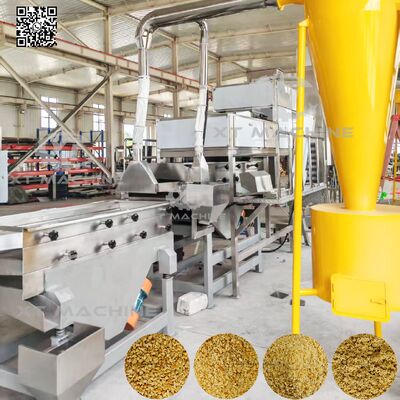 Splitste geblancheerde pinda's worden via een verticale vervoerband in de haker gevoerd, waar ze eerst in grove korrels worden gesneden door het eerste hakapparaat.Het materiaal stroomt vervolgens naar het tweede stap hakmechanismeMet een geïntegreerde trillingszieper wordt de output gesorteerd in vier uniforme specificaties, meestal verdeeld in 5-8 maas, 8-10 maas, 10-12 maas,met een gewicht van niet meer dan 10 kg,.